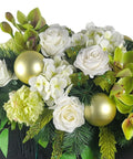 GHonor your loved one with understated elegance. This 28" saddle arrangement pairs serene whites and soft greens with premium water-resistant hydrangeas and ranunculus, creating a calming tribute that radiates peaceful beauty. Luxe velvet-textured leaves and subtle ornamental accents add refined sophistication, while seasonal evergreens and pines complete the composition. Designed to showcase magnificently against black marble, this thoughtfully curated arrangement speaks to a life of tranquility—a gentle yet powerful way to express your enduring love and respect.