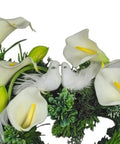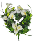 Discover a truly unique way to honor your loved one with this new mausoleum heart tribute. Featuring Soft Touch White Calla Lilies, Philodendron Leaves, Cedar, Sedum, Grasses. It's simple yet elegant design draws attention to the open heart, centered by delicate feathered doves. The calming white and green palette highlights its timeless beauty, making it a lasting tribute that speaks of love and remembrance for years to come. At 15 inches tall, this graceful tribute offers both elegance and heartfelt meaning.