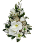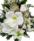 This exquisite mausoleum bouquet brings timeless holiday elegance to any memorial space. Featuring shimmering gold-glittered magnolia branches, miniature poinsettias, and delicate gilded accents, it's complemented by lush evergreens and pine for a sophisticated seasonal touch. The harmonious blend of white, green, and gold creates an understated yet striking tribute that captures the peaceful beauty of the season. Standing 18 inches tall, this premium artificial arrangement is built to last year after year, making it a meaningful investment in honouring your loved one's memory with enduring grace and warmth.