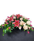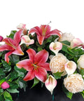 The "Reflection of Beauty" Saddle-PREMIUM-32" width features an elegant design of Real Touch Flamingo Oriental Lilies, Real Touch Tulips, Real Touch Calla Lilies, Peonies, and Assorted Vines and Garlands. The flowers are symmetrically arranged on all sides of the saddle, with a slight cascading effect that allows for clear visibility of any writings or etchings on the stone. With a 32" width, this saddle is made from high-quality Real Touch Stargazer Lilies, Real Touch Tulips, and Real Touch Calla Lilies from the "My Secret Garden Collection".