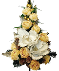 This "Love & Compassion" Mausoleum Bouquet features a stunning combination of Double Velvet Ivory Magnolia, Cabbage Roses, Gold Pine Cones, Gold Netted Leaves, Matt Gold Glass Ornamental Balls, Pine and other assorted evergreens. Its elegant and soft color palette makes it a versatile and timeless addition to any arrangement. With a height of 22 inches, plus an additional 7 inches for the stems, this bouquet is perfect for flower holders in mausoleums and can be used both indoors and outdoors throughout the holiday season. Don't miss out on this "My Secret Garden" Collection piece, designed for both beauty and functionality.
