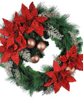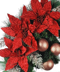 Celebrate your loved one's memory with this stunning 28-inch memorial wreath, expertly designed to captivate and inspire. Brilliant red poinsettias take center stage, beautifully complemented by shimmering copper ornamental spheres and sequined cedar branches that add dimension and sparkle. Nestled within a generous framework of artificial pine and evergreens, this wreath creates an unforgettable tribute that radiates warmth and reverence. Its bold, vibrant presence commands attention against winter's white landscape, ensuring your heartfelt remembrance remains a focal point throughout the season. A truly exceptional choice for honoring those who meant the most.