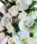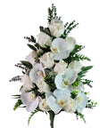 An elegant all-white arrangement designed specifically for mausoleum placement, this 15" bouquet combines lifelike White Phalenopsis Orchids and White Roses with Sedum, Berry Branches, and complementary seasonal foliage. Each element is thoughtfully positioned to create a refined, graceful composition that honors the moment with understated beauty and timeless sophistication.